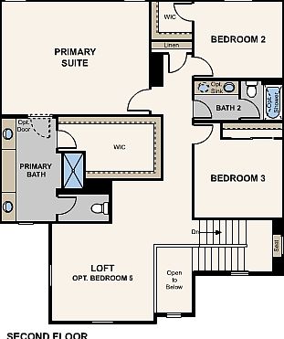 Entry into the Saffron is greeted by a dramatic two-story entrance and a view to the open great room. The open floor plan integrates the formal dining space with the great room and kitchen, maximizing the livability of the home. The kitchen features an oversized island and wrap-around counters, leading to a generous pantry, perfect for the needs of a growing household. The laundry room provides a private space to unload from the day when entering from the garage. A discreet coat closet is tucked under the stairs leading to the second story. Once upstairs, a spacious loft takes advantage of views towards the front of the home and provides space for numerous furnishing configurations. Near the landing, dual bedrooms flank a full hall bath and a linen closet. The oversized Primary Suite is located at the rear of the home boasts numerous windows allowing maximum natural light to illuminate the space. Dual vanities in the Primary Suite bath frame a window overlooking the yard, washing the space in another layer of light, while a sprawling walk-in closet completes the space.4 Bedrooms / 3 Baths / Dining / Loft / 3-Bay Tandem GarageOpt. 4-Bay GarageOpt. Suite at Tandem GarageOpt. Covered PatioOpt. Den at DiningOpt. Bedroom 5 at LoftOpt. Tub at Primary Suite Bath