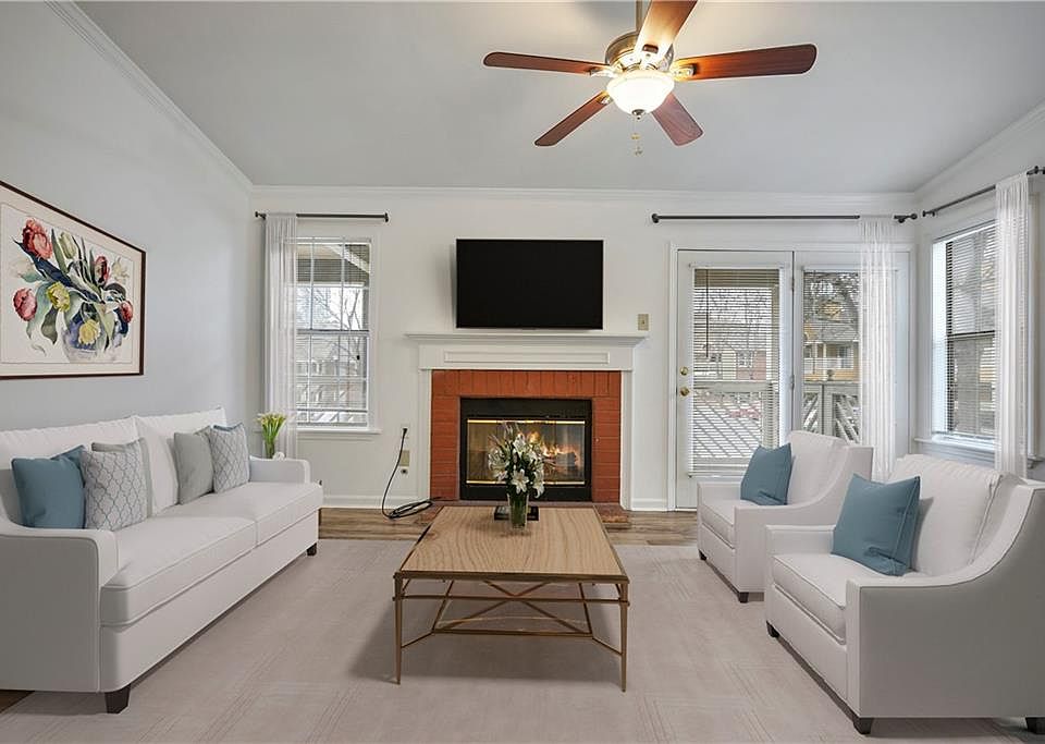 Fabulous condo in the coveted McGill Place community in Old Fourth Ward. Rare 2 bedroom 1 1/2 bathroom with new flooring and no popcorn ceiling! Fresh paint throughout. Open concept with oversized dining and living room. Kitchen features solid surface countertops and a pass through to the living room with a fireplace. Primary bedroom features a lovely bay window and provides an abundance of natural light. This unit features ample closet space plus a storage closet off of the deck. Screened porch perfect for morning coffee year-round. This gated community is truly one of a kind. One deeded parking space plus one registered guest space. It is in the heart of the city and features a pool, green space, and clubhouse. McGill Place is centrally located to everything you could want. You are just a short walk to the Beltline, Krog and Ponce City Markets, and Inman Park. Easy access to Midtown, Downtown, restaurants, shopping and 4 blocks from Marta. This is a rare top floor end unit and is a must see!