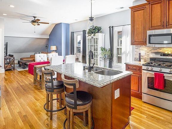 • Kit Dscrp: Flooring - Hardwood, Countertops - Stone/Granite/Solid, Breakfast Bar / Nook, Recessed Lighting, Dining Area, Stainless Steel Appliances, Cabinets - Upgraded, Kitchen Island, Open Floor Plan, Main Level, Remodeled, Gas Stove