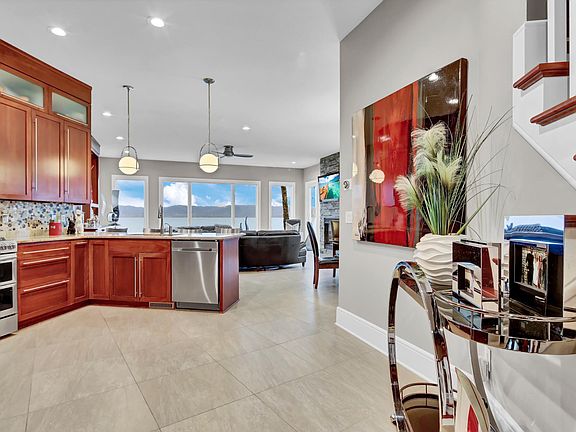 Discover the perfect blend of contemporary design and lakeside tranquility in this exceptional 3-bedroom 4-bath home just steps from the beach and marina. With breathtaking views, thoughtfully designed spaces, and luxurious finishes throughout, this property is a true standout.The expansive main level features soaring 10-foot ceilings and 8-foot custom doors, creating a bright and airy atmosphere. The chef’s kitchen is beautifully appointed with granite countertops, new stainless steel appliances (2023), a spacious island, and a wet bar complete with a built-in ice maker and beverage refrigerator. Perfect for entertaining, the lower level features a full bar with double ovens, a dishwasher, a refrigerator, and a custom built-in water feature that adds a sophisticated touch.The primary suite is a private retreat, offering a generous living area and serene lake views. Outdoor living is unparalleled with a two-tiered patio designed to showcase stunning sunrises and sunsets, complemented by a custom gas fireplace and torch lighting for a warm and inviting ambiance. A heated tandem garage adds convenience, while recent updates, including a new roof, furnace, water heater, and appliances (2023), ensure modern efficiency and peace of mind.Located in one of the best spots in town and not in a flood zone, this remarkable home offers a rare opportunity for luxury lakefront living. Schedule your private tour today.