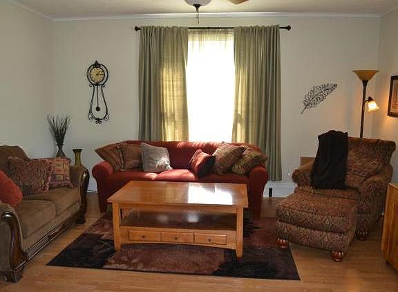 Move In Ready! Lots of love and wonderful memories in this home and now you can start yours! Laminate flooring throughout, new windows, two living areas, 2 baths, walk-in closet, updated kitchen, sun porch, large 2 car heated garage with work bench. One bedroom with built-in cabinets/countertop great for a craft area or office! Plan on barbeques and entertainment on the multi-tiered brick patio. Enjoy the lovely perennial flowers. Huge fenced yard - so much for this price!