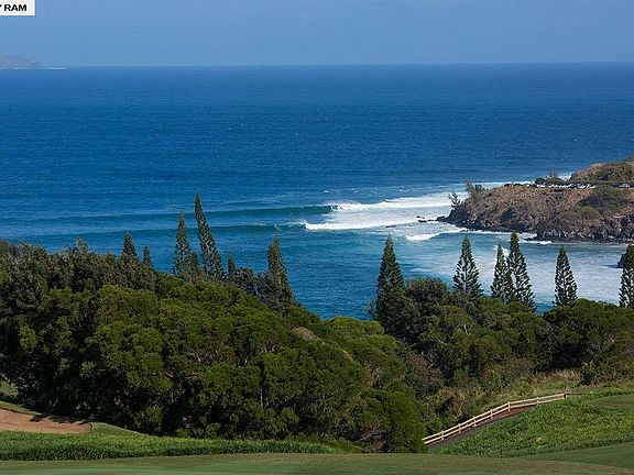Designed with indoor and outdoor entertaining in mind by International Architect Rick Ryniak, this striking single-level 6,484 square foot home sits on a 2-acre lot, fronting the Plantation Golf Course, with unobstructed views of the Pacific Ocean and the island of Molokai. The home features double poured concrete walls to insure the home's soundproofing, a Celedon roof, Leicht cabinetry throughout, butler's pantry, his and hers powder/changing rooms, redundant systems such as dual septic, dual washer/dryer, dual water heaters, dual central a/c and dual central vacuums to provide optimum comfort. The great room, dining area and gourmet kitchen are all spacious in size and open through pocket doors to the magnificent covered lanai and pool area. The master suite offers a panoramic view of the ocean, direct access to hot tub and pool, and includes: a media room, a large master walk-in closet, work room with washer/dryer and iron away; built-in cabinets and counters for crafts, separate bathrooms for him and her each with a private commode. The two guest suites feature walk-in closets, double sinks and private commodes. The "curve" theme is carried throughout: front doors, kitchen, wall showers with floor to ceiling glass panels reflecting the indoors with the outdoors. Co-listor is owner.