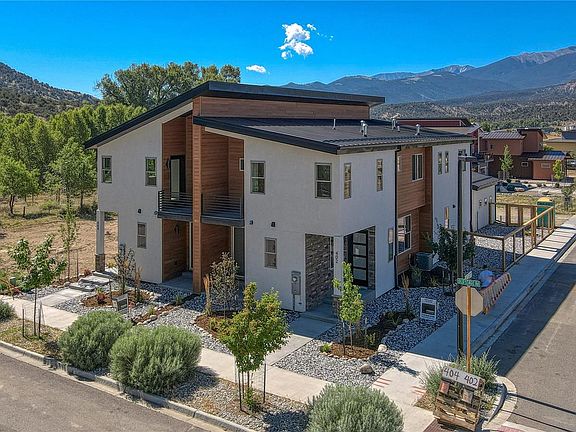 Nestled between the confluence of the Arkansas and South Arkansas River in Salida's most desirable new subdivision, sits this gorgeous upscale Townhouse. Brand new spacious 2,300 sqft 4 bed/3 bath townhouse built on a corner lot across the street from the Arkansas River in Two Rivers. Architecturally designed open concept floor plan with expansive windows, a fireplace and hand crafted beams set this house apart. Equipped with a large sliding glass door that walks out to the patio and fenced backyard, great for entertaining and provides beautiful views of the Sangre De Cristo mountain range while allowing the natural light to brighten up the kitchen. Custom cabinets line the west wall and are off-set by white quartz counter tops, a large island with tons of storage space, seating and GE Profile appliances. Completing the main level is a bedroom with a private patio and full bath. Take in the beauty of the surrounding peaks from the 2nd floor and sounds of the flowing river from the Primary bedroom private deck. The primary bathroom contains a double vanity, dual heads in the custom tile shower and large walk-in closet. Two more bedrooms separated by a shared bathroom, a laundry room with stackable washer and dryer and extra storage space sit on the 2nd level. A two car detached garage provides ample space for all your toys and is pre wired for an EV charger and solar. Enjoy Two Rivers walking paths and open space while minutes away from Historic Downtown. Live the Salida dream today!