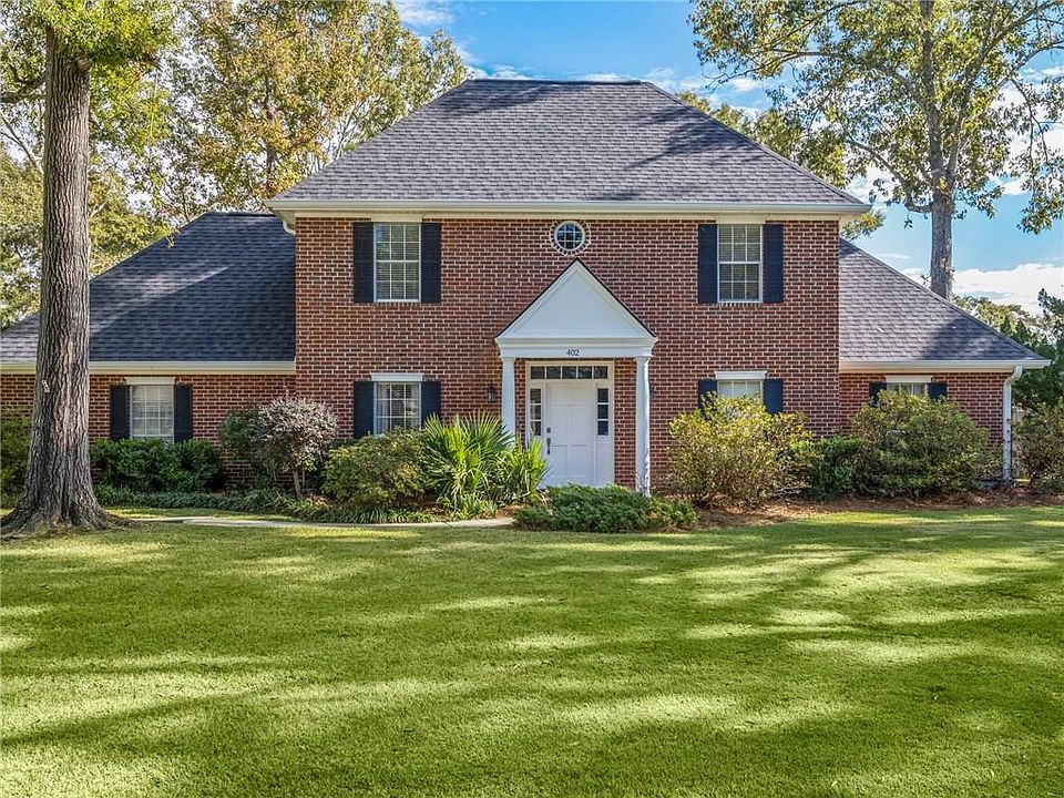 MOVE-IN READY ~ Stately Red Brick Georgian. 4 Bedrooms/2.5 Bathrooms with Primary Suite down. Kitchen has 3 cm granite, undermount sink, stainless appliances, breakfast bar opens to breakfast room with bay windows. New luxury vinyl plank flooring downstairs. Den has gas fireplace and dual French doors overlooking private fenced backyard. 40x20 concrete patio with parking pad behind newer fence (2021). Gutters added 2018. Roof replaced 2019. Low risk flood zone. Centrally located. Mandeville Schools