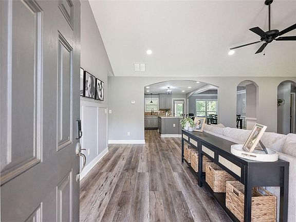 Designer colorsPrivate wooded backyardCustom built-insLarge islandAccent wallsBeautifully painted cabinetryProfessional landscaping