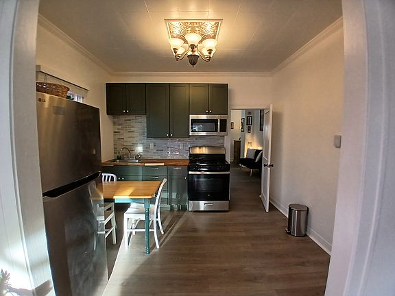 Modern touchesBrick-paved chestnut streetNew flooringStainless-steel appliancesGlass-tile backsplashCurated local artCustom kitchen