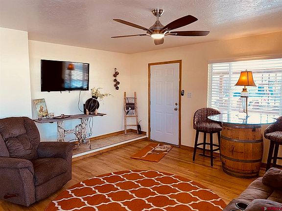 This is the one! Bright, cheerful and well-kept describes this lovely 3 bedroom, 2 bath home. It features a large open living room and a master suite! There's a dining area with a garden window and a roomy, well-appointed kitchen. You'll love the gorgeous wood plank flooring throughout which not only looks great but is easy to clean. The separate office space is conveniently located off the kitchen and the laundry room has an outside door perfect for entering the home from the concrete driveway. Both baths have been recently upgraded and you'll feel good knowing that the furnace, swamp cooler, and washer and dryer are only 3yrs old! There are ceiling fans throughout the home to help you stay cool in the summer and the double pane vinyl windows and higher end storm-doors will help you stay warm in the winter. The home sits on a corner lot offering plenty of off-street parking for cars and/or RV. There's beautiful landscaping with an in-ground sprinkler system for easy care. Plus, there is a large, fenced garden area complete with mature fruit trees, a garden shed and a frost-free spigot for the home gardener to enjoy. An additional workshop building with full electric and two other storage buildings offer lots of storage for your treasures. A covered front porch on which to enjoy the outside sunset view over Sleeping Ute Mountain is icing on the cake for this great home. The clever floor plan was designed with flexibility in mind. In addition to being a lovely home, you could also use it as two separate vacation rentals - such as an AirBNB, if desired. It would also allow for great privacy for an older child, mother-in-law suite or perhaps a roommate. This home is a must see for owner occupants and/or investors. It's move-in ready and easy to view! Schedule your showing today.