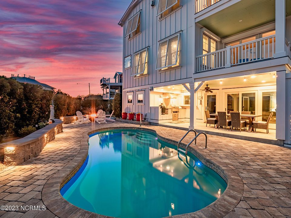Enjoy Coastal Living at its Finest! This 4 bedroom was a custom built home by Plantation Builders and designed with an inverted floor plan to maximize all the ocean views. The list of amenities is long, from a large family room with high vaulted ceilings that opens up to a large wrap around deck with awesome ocean views, a gourmet chefs kitchen with Wolf appliances, a master suite with a walk in shower, soaking tub, sauna, and exercise room. A new whole house back-up generator,  new HVAC & technology center. After a day at the beach you can enjoy your pool and hot tub to relax for the evening while cooking for your guest on your outdoor grill area. Best of all this home is not in the flood zone and only steps to the beach.