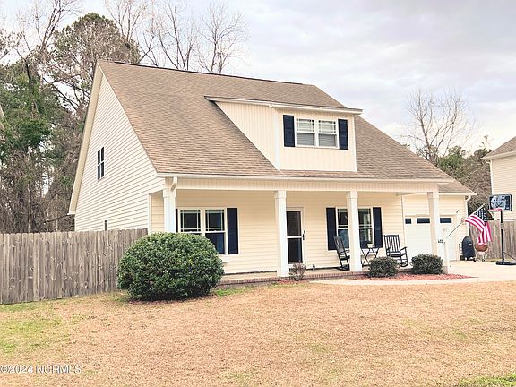 BEAUTIFUL and ROOMY 4 bedroom under $300k! Open floor plan with Master, bedroom #2, #3 on the main floor and 4th large bedroom (256sqft) is the only heated liveable space on the 2nd floor. Nice Laminate floors, granite in kitchen, 17' vaulted ceiling, on demand hot water, ceramic tile in baths, gas log fireplace, lots of closet space, fenced yard and walk-in attic for storage. Privacy fence, fire pit and covered porch in the front and backyard for your family to relax, enjoy, and privacy. Less than a mile from Brinson school, 10 mins to New Bern, and 15 mins to Cherry Point!