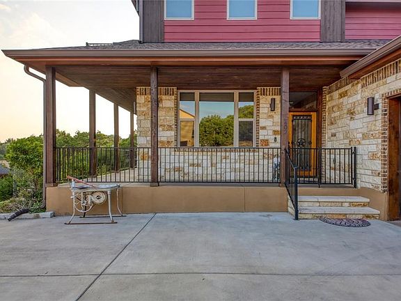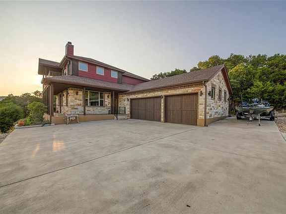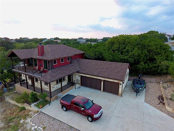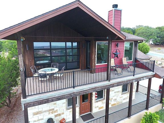 Beautiful Hill Country home with lake views from both floors! Master bedroom downstairs; open living/dning/kitchen area with built in bench seating at kitchen island. Upograded finishes include unique granite, custom wood cabinets throughout, acacia wood floors, Step-on-it deck coating. Upstairs boasts a game room inlculuding wet bar; and a home theater room with a glass garage door opening onto the covered deck for the perfect entertainment area and gorgeous day and night lake views.Restrictions: Yes