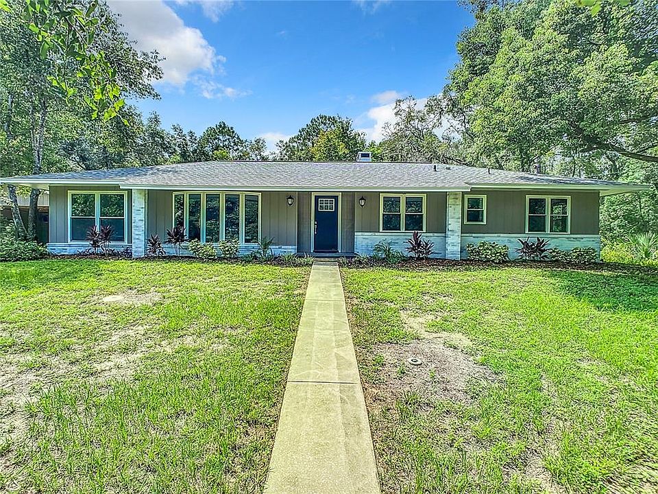 This is a must see! Fully renovated, private 2,907 square foot estate on over four high and dry acres in desirable Deland location. This 4 bedroom, 2.5 bathroom home has been fully remodeled and is in turn-key condition. Enjoy the stunning new kitchen with solid wood cabinets, modern hardware, new stainless steel appliances, two built-in pantries, new sink and faucet, plenty of (quartz) counter space and large eat-in peninsula. The interior is freshly painted in neutral grey tones which compliment the beautiful wood-look flooring, new baseboards and new light fixtures throughout. Home boasts new roof, new windows and triple sliding doors, new air conditioner, new water heater, new front entrance door, fresh paint inside and out, remodeled kitchen, new stainless steel appliances, remodeled bathrooms, new wood-look tile throughout, new baseboards, new light fixtures, wood-burning fireplace and three zone irrigation system. Fall in love with this peaceful oasis where deer and turkey roam and privacy is abundant. The back of the property offers multiple concrete pads for additional parking, three additional carports and plenty of storage. This home is centrally located right off Woodland Boulevard in the heart of Deland. Plenty of room for your RV, boats and trailers. No hoa. Don't miss this opportunity to own a gorgeous property with four acres in a prime location. Come see for yourself. Check out the video tour link showing the acreage.
