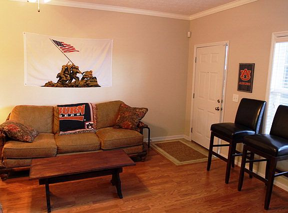 Condo in great condition on ground level with porch area! Two bedrooms with walk in closets and private bathrooms. Spacious living area with open kitchen and bar seating. Solid surface flooring in living room and kitchen. Large laundry room with storage and hanging space. Door to back patio and small yard area. Great location, one block from campus. Close to business and engineering schools.