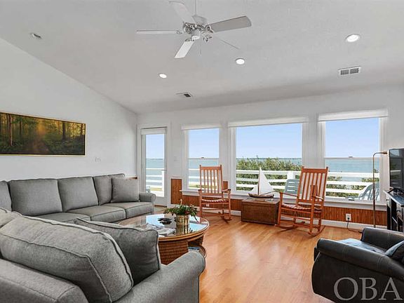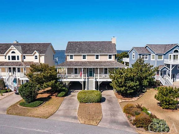 Sunset views over the Roanoke Sound from the idyllic wrap-around porch set the mood for tranquility and relaxation! Scenic delight from every vantage point! The natural beauty of the live oaks and junipers perfectly frame the panoramic water views. The built-in corner benches flank the true wrap-around porch and capture views of the pond, golf course, sound and beautifully landscaped community of The Village at Nags Head. The home is as exquisite as the views. It is in superb condition and enjoyed as a second home and primary home by the current owners for many years. An Old Nags Head style cottage with the customary cedar shake roof has an appeal to be admired for decades to come. The top floor consists of an open concept design for the living room, dining space and kitchen. High ceilings and a bank of windows welcome stunning water views. Overlooking the 18th fairway and green of the Nags Head Links course, the west-facing deck provides 180 degree views across the sound and extraordinary sunsets. The propane fireplace has a gorgeous and richly colored slate surround. This classic and pretty kitchen offers white cabinets, custom white panel refrigerator, stainless steel appliances and granite counters. The upper level en suite bedroom with full custom bath/walk-in marble shower, ample closet space, and water views is a delightful retreat. The front door of the cottage opens to a center foyer and hallway which separates the four bedrooms and 2 full baths on the mid-level. The wainscotting and white trim blend nicely with the gorgeous toned slate floors. The bathrooms have been updated and the custom tile work paired with traditional white vanities provide a tasteful coastal style. Access the wrap-around porch from the front or back of the mid-level and escape to the hot tub located on its own private deck overlooking the sound, just steps down from the porch. The bottom floor provides dry entry and great storage space. Another substantially sized "owner's closet" is also located to the rear of the carport. Two large parking areas are available under the house and shaded decks run along the rear of the cottage. An enclosed outdoor shower and outside wash sink are added amenities. The home is heated and cooled by two HVAC unit heat pumps. The tankless Rinnai system is propane fired. The cottage was completely renovated in 2009. The homeowners added hardwood floors and slate tile throughout the home. All bathrooms were upgraded with tile, new vanities and toilets. The kitchen cabinets, sink and counters were also updated during the 2009 renovations. The owners extensively landscaped the property and added additional decking and patio space making an outdoor oasis on the west elevation. The exterior shingles on the top floor were re-clad in 2008 and the owners have repainted the exterior on a regular basis. The cedar shake roof was replaced in July of 2016 using extra thick shakes and a breather- a solution for preserving the quality and life of a wood roof. This property provides all the perfect touches, serene vistas and finer finishes. Did we mention the views? Yes, we did because they are worth mentioning several times over... schedule a tour to experience this gem. The community amenities of The Village at Nags Head make ownership even more inviting! The Nags Head Golf Links is a Scottish-style 18-hole championship course with "holes along the sound among the most beautiful in the eastern U.S." according to Golf Digest. Membership is optional. The Village Beach Club offers a 5,000 sq ft oceanfront pool, restaurant, bar, tennis and private beach access; club membership is also optional for a fee and annual dues. The community's north and south soundside parks are loved by owners and guests. The oceanfront bath house and parking are another coveted community amenity.