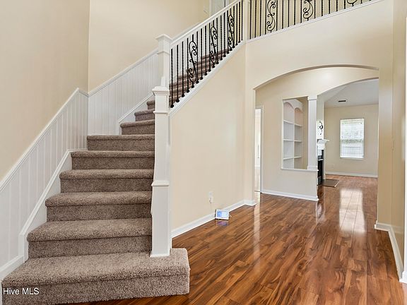 Located in the desirable Carolina Forest Subdivision, this recently updated home is walking distance to an elementary school, Walmart Express, restaurants and Western Blvd. This home is a perfect blend of comfort and convenience. With over 3,200 heated square feet, there is room for everyone to spread out and enjoy. As you enter the home, you will be welcomed to the elegant open two-story foyer that boasts beautiful wood laminate flooring, pillars and arches. Enjoy the grandeur of cathedral ceilings throughout that fill the space with natural light. The open-concept layout includes a spacious kitchen that includes a walk-in pantry and breakfast nook overlooking the living room, ideal for entertaining or keeping an eye on the family while cooking. The formal dining room features an elegant coffered ceiling, perfect for hosting gatherings. As a convenience, enjoy the laundry room located as you enter inside from the double car garage. You will also find a half bath tucked away for privacy. Downstairs you will find the large primary bedroom with a beautiful trey ceiling. Enjoy the primary bathroom that includes double vanities, a walk-in shower, soaker tub, private toilet, as well as a linen closet. The primary walk-in closet has an abundance of space for clothes, shoes or any other items such as military gear. As you venture upstairs, you will find the bonus room, and three additional bedrooms with vaulted ceilings, as well as two full bathrooms. Enjoy the flow of new carpet with fresh paint. The home comes with a private, fenced in yard that is perfect for pets, children or a garden. The entire home has been professionally cleaned—truly move-in ready.