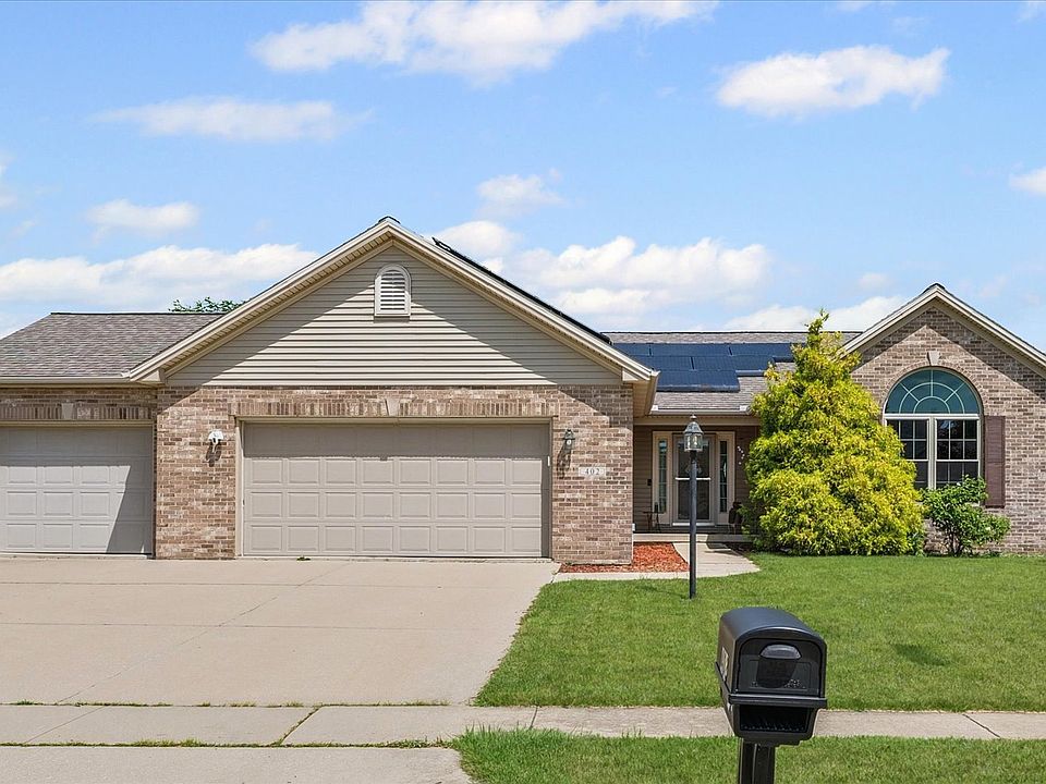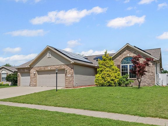 This spacious ranch-style home offers comfort, function, and room to grow with 4 total bedrooms and 3 full bathrooms. Enter into a welcoming, open entryway that flows into the living room and kitchen-designed with both everyday living and entertaining in mind. The kitchen features a large island and pantry, providing ample space for cooking and gathering. The split floor plan offers privacy and convenience, with a primary suite tucked away on one side of the home. Enjoy a large walk-in closet, dual sinks, and a separate tub and shower in the primary bath. On the opposite side are two generously sized bedrooms and a full bath-ideal for family or guests. Downstairs, the finished basement expands your options with an expansive open entertainment area, one additional bedroom, another full bathroom, and two large storage rooms. Outside, a fully fenced backyard and a patio offers space for pets, play, or gardening. A well-balanced home inside and out, this one has the layout and flexibility to meet a wide range of needs. Updates include: solar panels in 2023, furnace and AC in 2024.