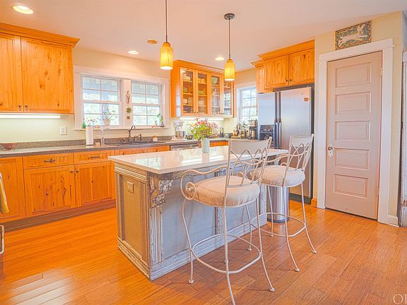 Amazing opportunity in Kitty Hawk! This custom Nags Head style home is water front and located on a huge property that backs up to the Kitty Hawk Woods Coastal Reserve. Enjoy picturesque views of the salt marsh and canal while enjoying nature in this beautiful setting. This spacious 3 bedroom home has so many features. Some of those features are bamboo flooring throughout, a beautiful country kitchen with a custom island and quartz counters, stainless appliances, wood burning fireplace, large living room, cozy tv room, ground level living space, custom details, large 4 seasons room with water views, outside shower, detached garage and so much more! The main level of the property is warm and inviting and offers a large foyer, half bath, kitchen, dining room, large living room with fireplace, separate tv room and a large four seasons room. This level also accesses the custom covered porches which are a great place to take in the beauty of the nature that surrounds. The top level boasts 3 bedrooms and 2 full baths. The primary bedroom is a huge room with a walk-in closet, private bathroom with double vanity and water views. The 2 secondary bedrooms are spacious with beautiful custom features. The top level also has a convenient laundry room with a flex space and water views. This room is currently being used as an art room but has possibility for other uses. The ground level of the property has a mud room which creates a dry entry for the home, a large living area and a 1 car garage. The ground level living area is serviced by a window unit and is a perfect recreation room or a workout room. The ground level living area is not calculated into the heated square footage of the property but adds functionality and extra space to this wonderful home. The outside spaces of the property really shine with covered areas, covered decks, landscaped grounds and outside gathering areas. There is even a detached garage! From the back yard, walk out the approximately 200' pier to a large dock where you can fish, crab, launch kayaks or take your skiff out to Kitty Hawk Bay! Public boat ramp is seconds away where you can launch your larger boat and gives you direct access to Kitty Hawk Bay! This home has been a family home for many years and has been lovingly used and cared for. It is in move-in condition and even has a brand new fortified roof! It is a must see!