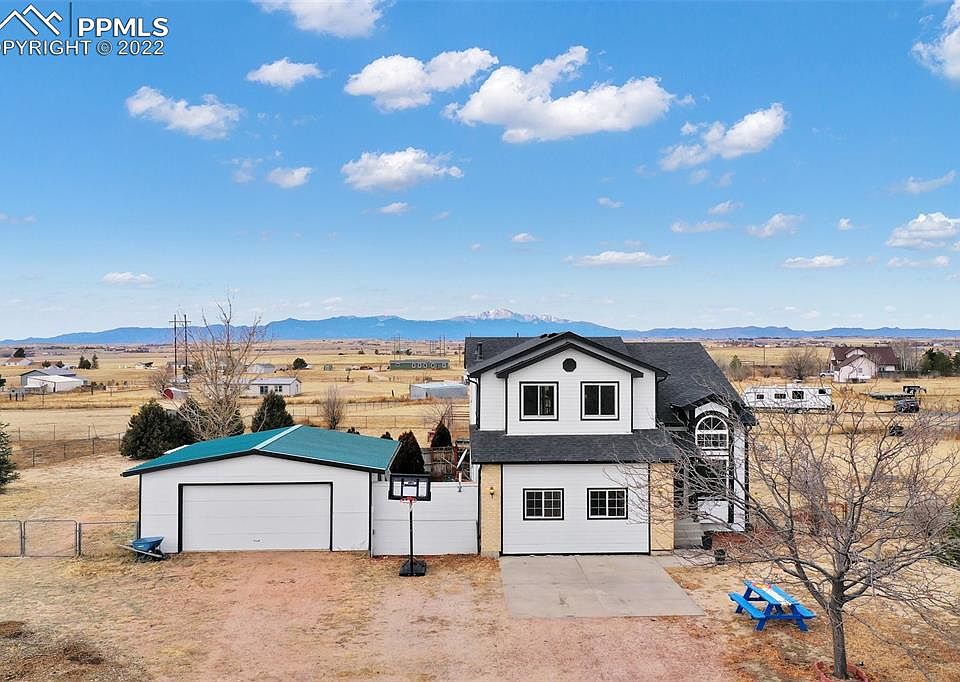 PERFECT HOBBY FARM - 2.5 acre property zoned for horses, chickens, goats and more! This 4 bedroom, 4 bathroom, 2+ detached garage with workshop area is perfect for country living and privacy. Walk into the lovely sitting room with high ceilings, making this home bright with plenty of natural light. The kitchen/dining area has lovely NEW windows and sliding door with amazing views of Pikes Peak and the front range. Kitchen has matching stainless appliances and walks out onto a spacious deck. The family room is also on the main floor; spacious and has a sliding door as well. Upstairs you will LOVE the primary bedroom with it's view of the mountain range and attached bath. Two additional bedrooms and full bathroom are upstairs. All luxury vinyl plank flooring is new in bedrooms upstairs. Basement has an additional bedroom with attached 3/4 bath and a separate room which could be used as an office or workout space. The detached garage is oversized with a work bench, is HEATED, and has an Recreational Vehicle plug. All outdoor space is usable land and is fenced. Sellers have used the back area of the home as a campsite with tent sites, fire pits, and an RV dump station. Many extras are included in this home to include the chicken coop with nesting boxes, roost area, and close to electric for heat. An enclosed area for rabbits for small animals. Plus, additional shed in backyard, previously used for a coop.