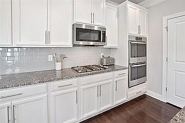 - Kitchen Features: Eat-in Kitchen, Pantry, View to Family Room, Stone Counters, Kitchen Island, Cabinets White