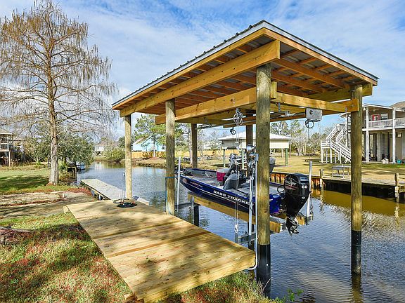 150 FEET of WATERFRONT!!! ***New Adjusted Price + $2500 towards Buyer's Closing Costs!*** Huge concrete slab under home that encourages cool breezes and the perfect setting for crawfish boils and bbq's. Charming home approximately 110' to canal that leads to Bayou Lacroix the Jourdan River! The interior is completely NEW as of 2018 as well as NEW HVAC and NEW Hot Water Heater. Brand NEW Boat House & Refurbished Dock with water & electric in Oct. 2019 as well as NEW 40' pier! NEW insulation under home & NEW 30' awning on back porch. Huge laundry/utility room. Grab your toothbrush and move in!!!