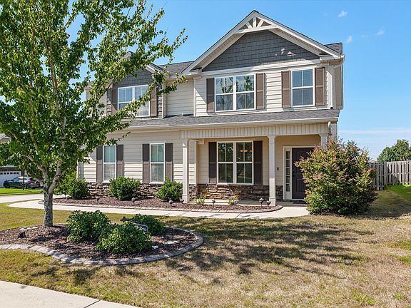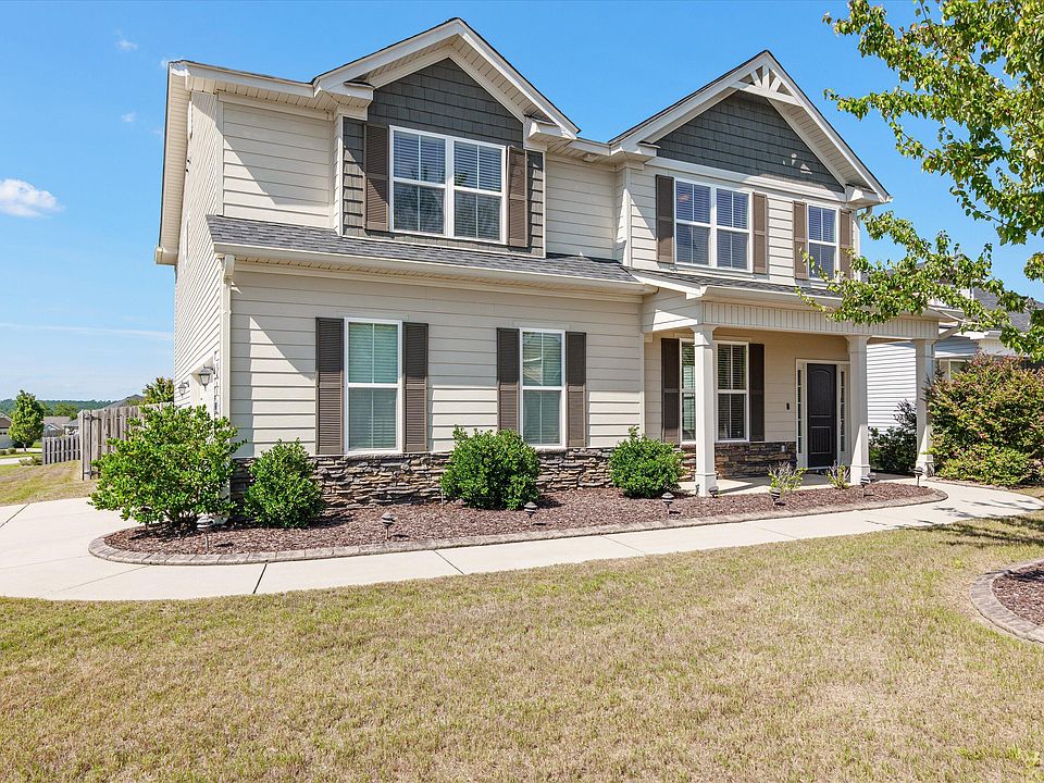Move-in ready & like new with a charming rocking chair front porch! All New Interior Paint! This beautiful, meticulously maintained home is situated on a corner lot in Hayne's Station with a side entry ,double garage and a large fenced-in backyard. This 4 bed/2.5 bath home features hardwood floors throughout the main living areas. Welcoming foyer flows in into the formal dining room which would also make a great office space. Open Kitchen features a large island, ample cabinetry, granite countertops, stainless steel appliances and a walk-in pantry. Just off the kitchen, you will find a convenient mud bench with coat hooks. Kitchen opens to the breakfast room and the Great Room with a stone fireplace along with access to the spacious backyard. Powder room located on the main floor adds an extra convenience.