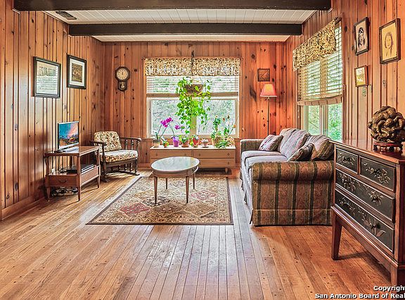 Don't miss out on this charming house close to Canyon Lake. This house features a large front porch, 3 bedrooms, 2 full baths and 2 living areas, detached 2 car garage. It has hard wood floors and sits on a great hill country lot. Walking distance to all amenities including boat ramp, community pool, park, and fishing pond! Lot size is .998 per seller