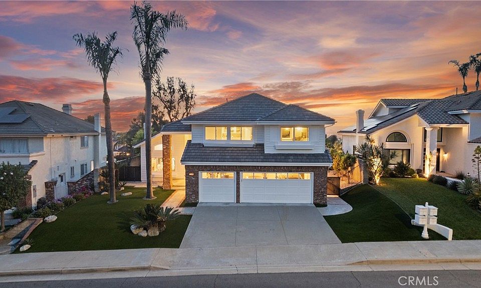 Welcome to 4021 E. Regency Ave, nestled in the prestigious Belmont Estate of the enchanting City of Orange. This exquisite residence offers a captivating panorama that transitions seamlessly from breathtaking sunsets to peak of ocean views on clear days, and even the magical spectacle of Disneyland fireworks at night, epitomizing luxurious living at its finest. Approaching the property, impeccable curb appeal welcomes you with lush turf grass, swaying palms, and a freshly painted exterior complemented by a three-car garage. Step through the inviting double door entry to discover an interior exuding sophistication and charm. The grandeur of the formal living room, adorned with high ceilings and a cozy fireplace, effortlessly flows into a spacious dining area graced with french doors opening to the expansive backyard. Recently upgraded, the chef's kitchen is a culinary haven boasting pristine white quartz countertops, abundant cabinetry, and a central island with a five-burner gas cooktop, double ovens, wine cooler, refrigerator, dishwasher, and a captivating view that transforms cooking into a delightful experience. Continuing the journey, the open layout seamlessly connects to the family room, where another fireplace and a wet bar await, providing an ideal space for relaxation or entertaining against the backdrop of breathtaking vistas. A versatile downstairs bedroom, currently utilized as an office, and a full bathroom offer convenience and accommodation for guests. Ascending the graceful dark brown spiral staircase, the opulent master suite awaits, featuring lofty ceilings, a cozy fireplace, and panoramic views stretching across the city and mountains. The lavish master bathroom indulges with dual walk-in closets, a stand-up shower, a tub overlooking the picturesque scenery, and dual sinks for added comfort and convenience. Additionally, two generously sized bedrooms and a spacious bonus room, currently appointed as an upstairs family room with lush views, a built-in bar, offer ample space for family movie gatherings. Step outside to discover the expansive backyard oasis, complete with a golf putting area, lush turf, and serene vistas, perfect for unwinding and entertaining. Close to freeways, this home also boasts a new roof and Anlin windows. The community beckons with a plethora of amenities including walking trails, nearby hiking opportunities, acclaimed schools, golf courses and an array of dining options.