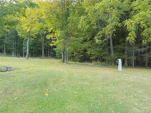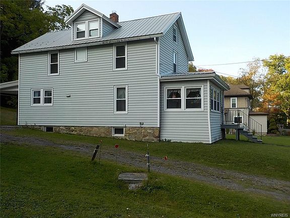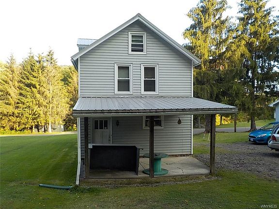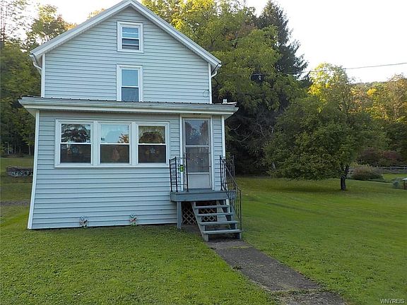 NEW PRICE ADJUSTMENT.Property is being sold AS IS.GREAT OPPORTUNITY TO MOVE TO A Peaceful setting with a view from the back patio of a wooded wonderland. Just bring some TLC. New bathroom that has never been used. Water is public but will require turn on at street. Sewer available, purchaser responsible for hook up. Does have an existing septic system that has not been used for 5 years. Duct work present , furnace will need replaced.Natural gas available. Two large garages that offer 4 parking spaces and an additional covered parking space attached to front garage. Two driveways and one is shared. Plenty of space for all your vehicles and a great workshop. Kitchen has a built in vintage oven and all appliances are included. The house needs a little TLC inside, but a great private area close to The Hickory Inn, Corner St Deli, and shopping in Salamanca.