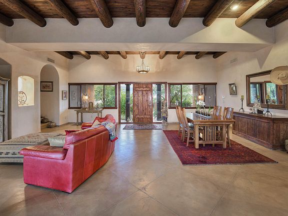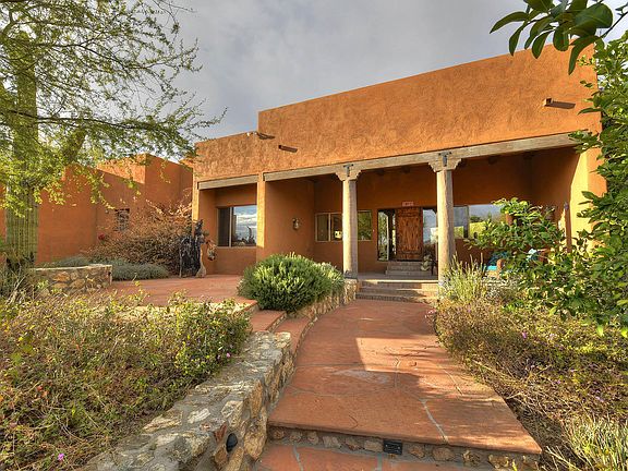 Enchanting Santa Fe home situated near Aqua Caliente park, Rincon & Catalina Mtns. Enter a lovingly landscaped courtyard with fruit trees, patio and covered porch. Inside a Great Room with plaster walls, beamed high ceilings, fireplace and large windows look out to a captivating backyard. Split floorplan includes a master suite with fireplace, guest suite, guest bedroom and hall bath on one wing and two additional guest bedrooms and full bath on separate wing. Large covered back porch with stone fireplace. Beautifully landscaped yard with pool and spa.