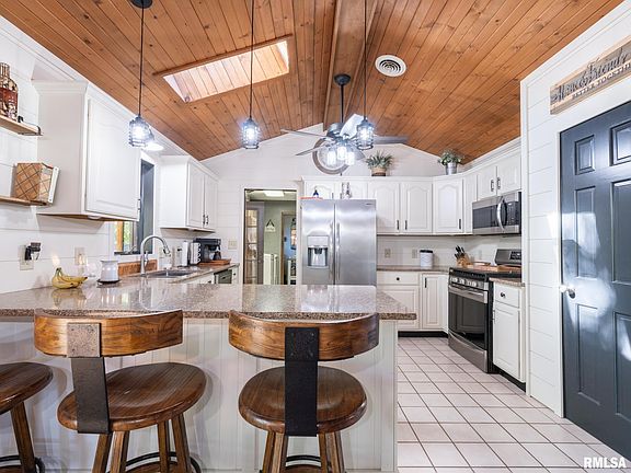 Immaculate fully remodeled brick ranch with windows galore and open floorplan on a double-lot with breathtaking views and 165ft of water frontage on beautiful Lake Camelot. This lake community offers 45 acres of serene LAKELIFE to enjoy boating, fishing, swimming/tubing, tennis/baseball/pickleball activities, pool, a sandy beach and clubhouse. Inside, this beautifully updated home with over 2600 finished sqft has been meticulously madeover with new LVP flooring, paint, lighting, ceiling fans, hunter blinds, stairway and shiplap walls. Don't miss the custom built-in bar space (2023) the entire family can enjoy while entertaining guests! Primary Suite/Bathroom with custom built walk-in closet has increased overall ft². Cathedral ceilings w/ skylights, main-floor laundry, 3-car garage and convenience of a finished walk-out basement! Unlimited storage options inside and out with heated workshop and additional 14x22 shed. Relax, unwind and enjoy the shade or sun on your own new dock, deck, lower patio or front and back porches. Newest exterior updates include a complete backyard makeover (2021) removing old decking and trees opening up your lakeside views with a complete custom built seawall and new wood dock (2022), new quality decking, railings and huge, new concrete patio (2024). Enjoy your amazing screened porch during your early morning fresh air or late night entertaining with all new screens/doors (2023) and more! A/C/Furnace Boiler-2019, Roof-2020 (tear off)+ gutter guards