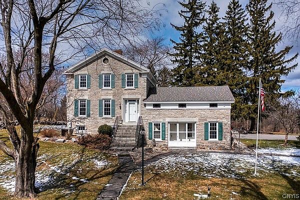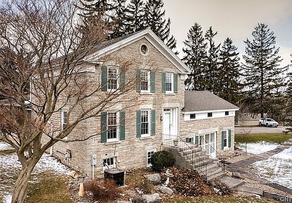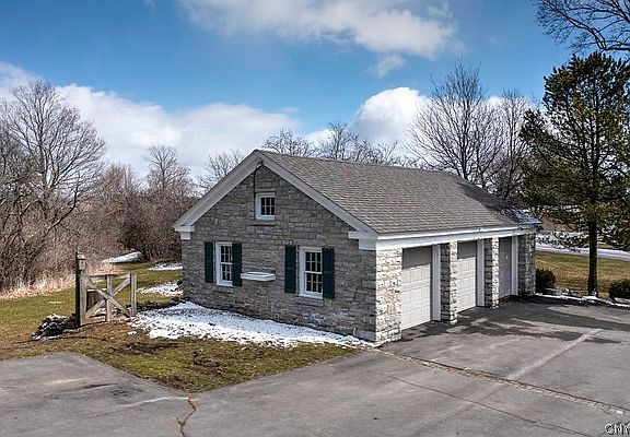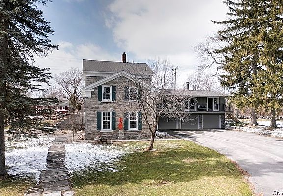 "Stone House at Split Rock" built in 1833 has much to offer. This beautiful one of kind home sits on over 16 serene acres ideal for horses, outdoor sports and trails minutes from Syracuse. The home features 5 bedroom and 3.1 baths, master suite, huge living room with fireplace and balcony, original floors, stately dining room with fireplace and original staircase railing. The first floor boasts with the large family room and office with wall to ceiling bookshelves and separate screened recessed entrance. You'll also find a spacious laundry room and half bath beside large mudroom/crafting room exiting into oversized 3 car attached garage. There is also a beautiful 3 car detached stone garage that was a horse barn and a large shed for storage. ( 1.86 acre lot, 4015 Split Rock Rd, is also available for purchase at $59,900 s1462278). Contingent upon home inspection