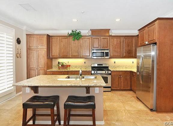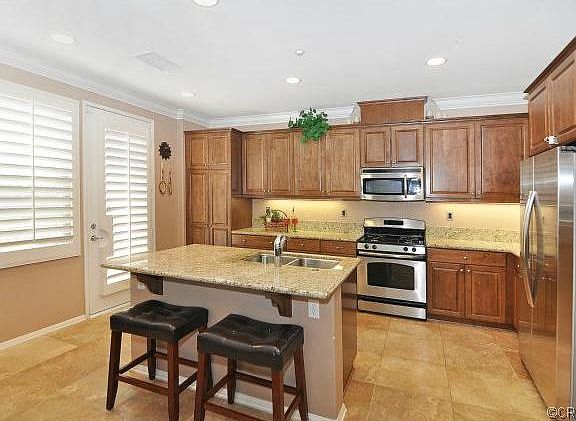Gorgeous!! Light and Bright 3 large bedrooms and 2.5 bath home. One of the bedrooms has it's own private balcony to relax and soak in the sun. Located within walking distance to highly sought after Yorba Linda High School. This home features Beautiful crown molding and plantation shutters throughout the entire home. Walnut cabinetry, granite counter tops, stainless appliances and a large preparation island in kitchen. Bathrooms have marble slab counters and all three very spacious. For your convenience the Laundry room is upstairs with plenty of storage and a utility sink. Flooring downstairs is a neutral porcelain tile and rich looking wood flooring throughout the upstairs. Enjoy the Pools and Tot lot that this community has to offer. This home is complete with a two car attached garage with plenty of storage and epoxy flooring. It also has a great patio for bbq's with access to the wonderful kitchen. This spacious 1850 sq ft home is turnkey and ready for a new owner.