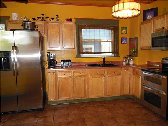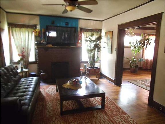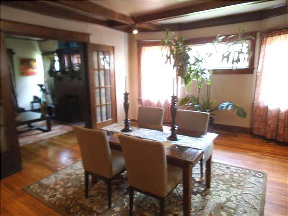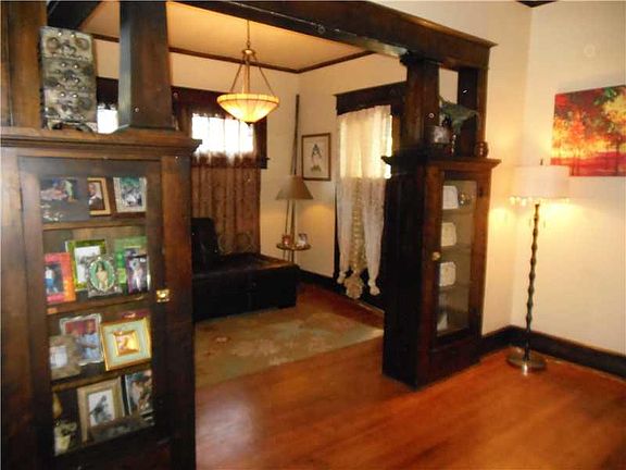 Ohhhhh, baby! 4BR 1.5 bath BRICK home. Class,style,updates! Foyer w/mission-style columns flanking living rm. Cross-beamed ceilg, blt-in leaded-glass buffet, French doors to dining rm w/ bay window. Swinging door to updated maple kitchen, tile flr. Updated full bath, tiled surround w/ 7 shwr heads! 3d flr is playrm/bonus; wndws on both ends for cross ventilation. Some thermal wndws, great hdwds. Newer 2-car garage. Fenced yd, stone patio.Front porch invites neighboring!
