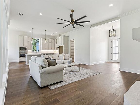 This beautiful new GMI Construction home features 5 bedrooms and 3 full baths as well as a separate office space with a built-in desk! Beautiful wood floors in all living areas plus all bedrooms (no carpet!); 8ft. doors; exposed beam between den and foyer; den with sacked fireplace and beam mantle opens to the dining room and gorgeous kitchen with Quartz countertops, large island, hexagon tile backsplash, stacked cabinets, GE appliances, farm sink and walk-in pantry. The primary suite includes bedroom with tray ceiling with wood slat inlay and spa-like bathroom with stand alone tub and large shower with beautiful tile surround. Mudroom area; covered patio overlooks large rear yard; flood zone C; great school district; subdivision pool! 30 feet of green space behind the lot.
