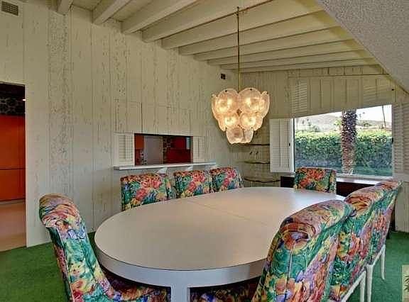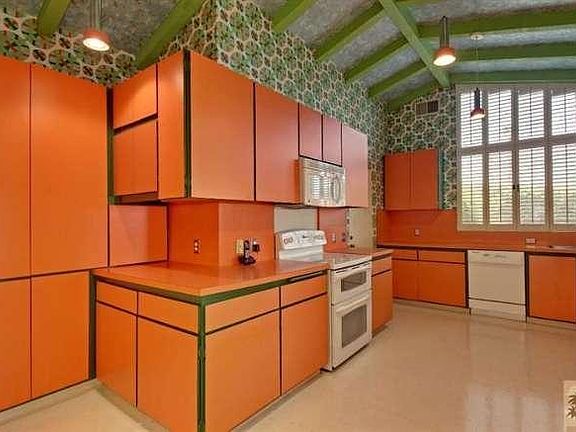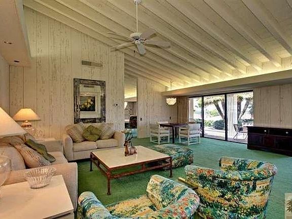 This very kitschy period piece of 1970 features 3 very generous bedrooms, 3 bathrooms, 2,663 sq ft., a large Living Room with high ceilings, fireplace, and Dramatic views of the Valley Floor below. The Formal Dining room also feature expansive views. The very orange kitchen is wonderful, fun, and very pleasant to hang out in, also with views. The exterior has a very large side yard, an enormous View patio, and a patio off the entrance. There is a spa off the entry, the nearby area pool is used by only 4 homes. There is a 2 car garage. The community has 15 pools and spas, 24 hr guard gated security and on site manger. There is golf cart access to Thunderbird Country Club. Furnitures is available outside of escrow.