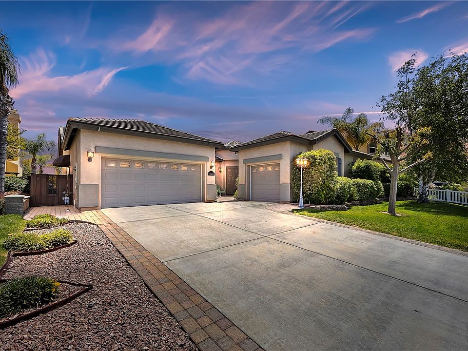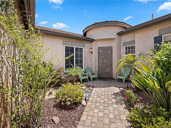 Stunning Clarendon Hills Single Story with over 2700 sf of open living space. Clarendon Hills is a highly desirable community of all single story homes centrally located in Murrieta. Private location at the end of the street and front yard has stacked stone planters and driveway trimmed with pavers for added curb appeal. This home has 4 bedrooms, 3 full bathrooms and three car garage. Three bedrooms on one side of the house and a very large bedroom/possible secondary master suite on the other side of the house with access to the single car garage bay. Enter through an inviting courtyard with brick pavers and custom wrought iron door screen. As you enter, you are greeted by a very open great room complete with wood laminate and tile flooring and lots of windows. Many windows are cased throughout and crown molding adds a special touch. Elegant kitchen with large central island and tile counters finished off with glass tile backsplash and rich wood cabinets with upgraded hardware. Massive walk-in pantry and a convenient office niche area in the kitchen that will definitely be put to good use. Kitchen opens to the large family room with a stately stacked stone fireplace and custom built-ins. Spacious master suite with large master bathroom with double sinks and pendant lighting. Ample walk-in closet to help keep you organized. The laundry room has extra cabinet space for storage and there is also storage space and built-ins in the garage. Enjoy relaxing and entertaining in the impressive backyard complete with Alumawood patio cover with column pillars, full length stacked stone seat walls and easy to maintain artificial grass. Pad ready for a future jetted tub. A great space to enjoy beautiful California weather with a relaxing ambiance. All this in a community with very low homeowners association and low tax area. Close to shops, restaurants, schools, parks & award winning Temecula wineries. Home is located just a very short distance from Vintage Reserve Parks, perfect for a quick walk, playtime or running your dogs. Easy access to both the 15 and 215 freeway. Exceptional single story home in a great location....welcome home!