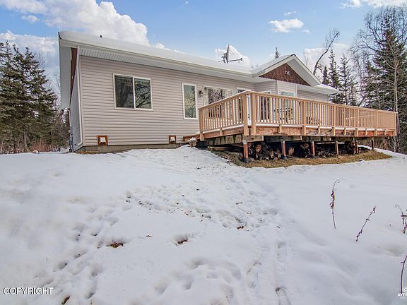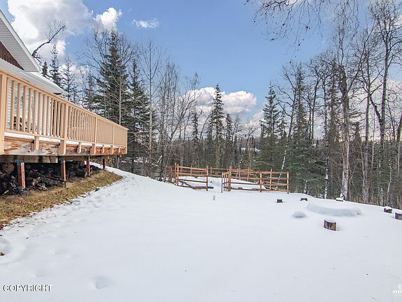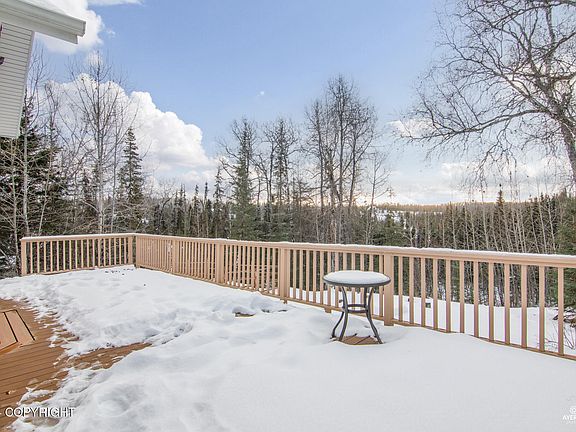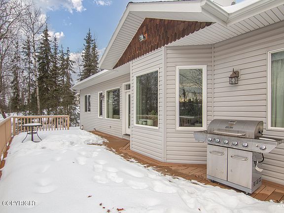 First impression is endless lge windows, 10' ceilings & immaculate throughout. Great floorplan, lt living rm, formal dining, roomy kitchen with sink update & nook with bay windows. Mst Bdr ensuite, remodeled bathrm incl twin sinks, shower & tub. Guest rooms on opposite side one being currently used as a gym. Back deck overlooks a small lake, rolling hills & every kind of wildlife.Like new, well cared for spacious Ranch style home and xtra large garage. Custom tile work, In-floor heat, custom Master Bath design with Quartz Countertop, Galley style kitchen with access at each end & a Breakfast Nook, Hickory kitchen cabinets with pull-outs, beautiful Corian countertops, ceiling fans, a Formal dining room - could be Office, Southern Exposure, Insulated vinyl siding, crushed gravel driveway, & good drive-up appeal. Home Warranty included. See documents for more features & photos. Some Things that Make this Place Magical: " We very, very rarely ever lose power here! " If we have enough snow, you can ski out the back door down to the meadow and turn right to get to the little lake; it's about a mile loop around the lake. " Standing in the kitchen prepping food, watching the little lake sparkle from the sunshine. " Birds - our back yard has been described as "sounds like Jurassic Park" in the spring due to all the songbirds (Merlin app has recorded 15 different species at one time and that didn't include the woodpeckers, grey and blue jays, cranes and eagles seen in that same time frame. We've had generations of a family of grey jays that comes every spring/summer and will eat out of your hand; they really like Dave's Killer Bread 21 whole grains and seeds variety! We also have resident neighborhood eagles (they had built a nest on our property line and had babies two years ago, but the nest blew over in a windstorm. Hopefully they will build another one, but they still hang out in the trees and fly around). We regularly hear the Great Horned Owls in the fall/winter and they've landed on the deck and flown overhead pretty close. The arrival of the neighborhood cranes announce spring is here and the loons calling from the lake in the summer is relaxing. " Wildlife- we have seen a wolf, a fox, bear, caribou, lynx and tons of moose, hares (there has been a family living on the property for the last few years and they've never bothered the garden), spruce hen and the coyotes will wake us up howling at times. " The south facing windows equal lots of beautiful light in the house in the winter and a hot deck in summer, perfect for lounging/reading/bird watching/eating outside. We also have amazing views of the sunsets and sunrises in the winter. " Your view will remain your view, you don't have to worry about development with the way the property lines are and the native land around the neighborhood. " We have a large variety of trees, and most beetle kill has been removed; willow, aspen, birch, cottonwood, mountain ash, black and white spruce, alder, larch and chokecherry trees we planted (not the invasive kind). The house sits on a little hill so it's elevated into the tree line, making you feel like a part of the forest when you are sitting in the house or on the deck. " Foraging on property-we have propagated morels, and we now get a few handfuls of them that come back each year; they are down on the slope behind the fire pit usually between the last week of May-first couple weeks of June depending on weather; high bush cranberries, fireweed, spruce tips and wild rose buds. There are also a couple haskap bushes we planted in the front that produce delicious berries if you can get to them before the birds. " Flowers- we have wild roses, lupine, fireweed, forget-me-knots and dogwood, and a couple of wild irises next to a rock in the woods out front.