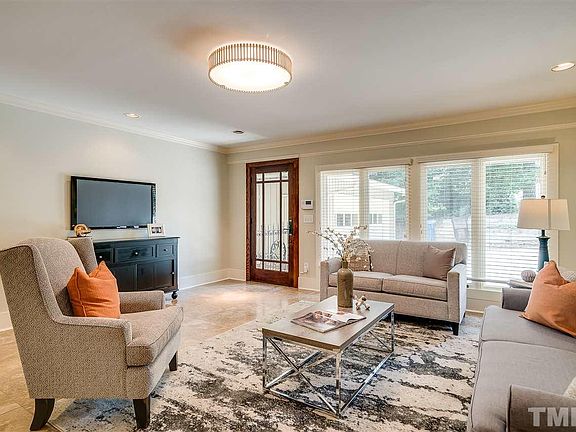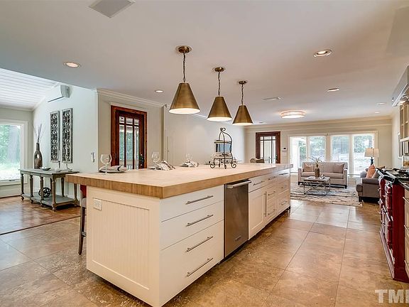 Rare Mid Century design on private Historic Hope Valley lot. This home offers something for everyone whether you want to curl up with a good book or entertain a crowd. 12ft. butcher block island in chef's kitchen featuring new range all designed and styled by renowned Durham owner-chef. Picture windows span open floor-plan offering abundant natural light and view over private acreage and pool deck. His & Her private master baths and apt-style suite on lower level perfect for au pair, visitors or rental.