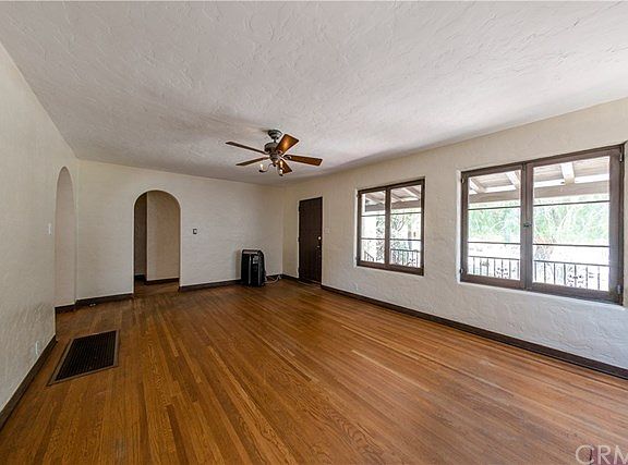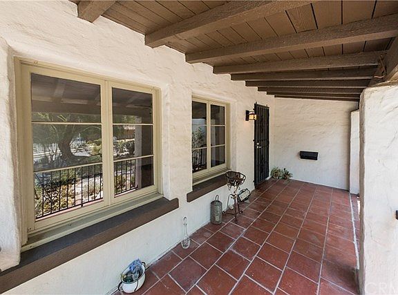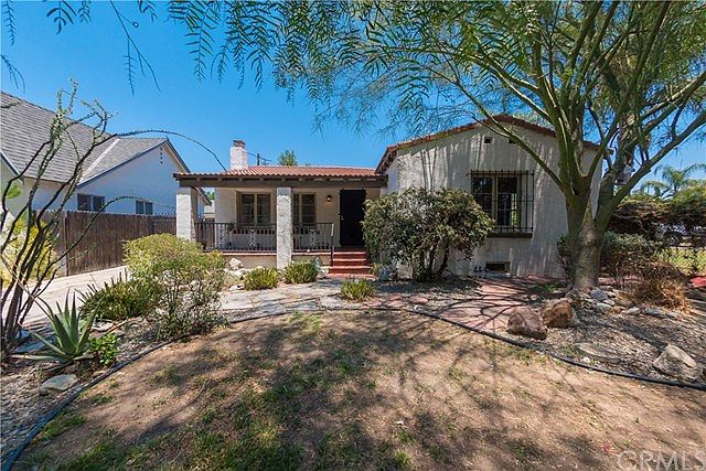 This home exudes Spanish Charm. Enjoy quiet evenings on the porch. You will notice the original doors and hardwood floors. The tile trimmed fireplace is beautiful. The living room is light and spacious. Arched doorways highlight the formal dining room with french doors out to the back yard. the kitchen was remodeled, keeping the charm and character of the home. the laundry facility is off the kitchen. Absolutely gorgeous main bathroom with original tile. Handy powder room with copper sink in the master bedroom. Walk in closet. Whole house fan helps keep you cool. 1 car garage being used as a workshop/office. New heat and air to be installed before close of escrow.