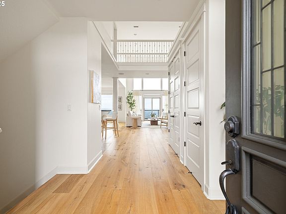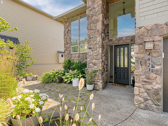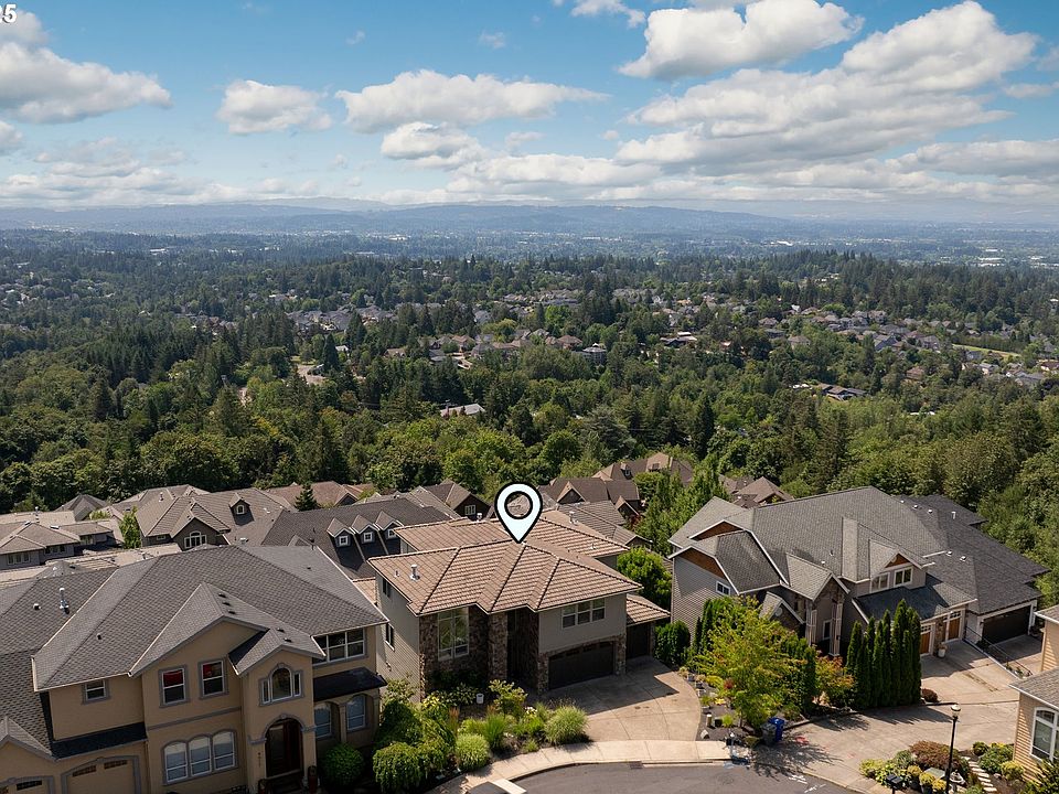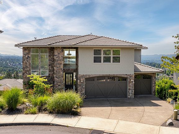 Perched high above Forest Heights, this striking 5-bedroom, 4.1-bath residence captures breathtaking Valley and Coast Range views while showcasing refined, minimalist design. The south-facing orientation floods every level with natural light, enhancing the home’s airy, elevated feel. The main floor features a dramatic double-height living room with floor-to-ceiling windows, a sleek office, elegant dining area, and a chef’s kitchen designed for both style and function. Unwind by the fireplace or take in sunsets from one of three expansive decks. The fully renovated lower level is ideal for entertaining, complete with a designer kitchenette, built-in dining and lounge seating, and a dedicated theater room. This level also includes two bedrooms (one ensuite) and an additional full bath. Step outside to a rare flat patio and spacious outdoor gathering area—perfect for hosting or relaxing. Upstairs, the luxurious primary suite offers a private balcony and a spa-like bath with a soaking tub and fireplace. Two additional bedrooms and a full bath complete the top floor. Recent updates include new hardwood floors, carpet, interior and exterior paint, upgraded lighting, custom cabinetry, fresh landscaping, and more. With nearly 4,500 sq ft of flexible indoor-outdoor living, an oversized three-car garage with built-ins, and a versatile multi-level layout ideal for privacy or multi-generational living, this home offers the ultimate blend of sophistication, comfort, and convenience—just minutes from Nike, Intel, Forest Park, downtown Portland, and the Pearl District. [Home Energy Score = 1. HES Report at https://rpt.greenbuildingregistry.com/hes/OR10231548]