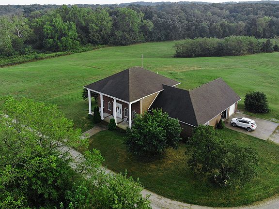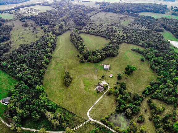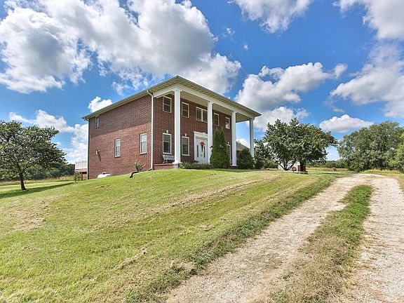 Picturesquely positioned on a knoll overlooking a private pond, you will find a stately home on 53+/- acres NW of Bolivar within minutes of town. From the stately columned front porch that spans the all brick, three level walkout basement home. walk thru the double door entry into a large living room. Thru the pocket doors, you'll find a huge open kitchen dining area with tall ceilings, granite counter tops, and a master suite, a 2nd bedroom and laundry room. Head up the beautiful wood staircase to the second floor with a large open living area & 3 additional large bedrooms. The full walkout basement has a family room, 2 bedrooms, wet bar, mechanical room and storage space. The partially wooded acreage is fenced with hay fields and a wet weather creek. Two car attached garage and