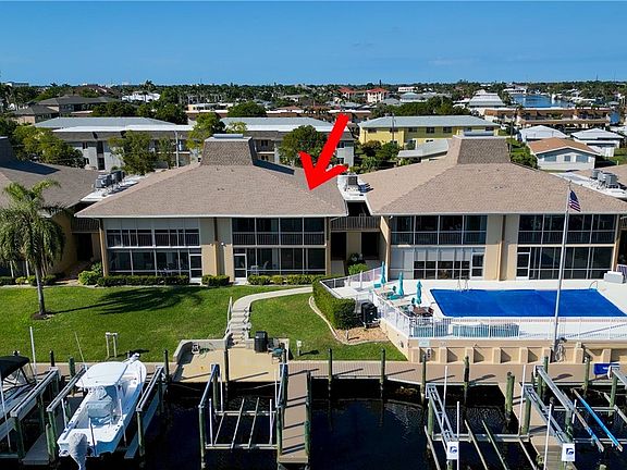 Rare find! Meticulously maintained 2nd Floor, 3-bedroom, remodeled end unit condo with breathtaking views of the 200ft wide Phoenix canal allowing boat lovers a wonderful turning radius (especially for larger vessels if needed) offering direct access-literally one turn to the river and your off to Sanibel, Fort Myers beach etc. via your private boat dock featuring 16,000 lb boat lift. Interior updates include; beautiful kitchen with high end LG finger print /smudge free black stainless-steel appliances, quartz countertops, tray ceiling with lighting accent, undercabinet lighting, attractive tile back splash, custom pantry with butcher block counter, 2 hanging pan racks, cabinet for storage with pull outs, baking sheet/tray rack storage, storage and outlet to house & use your small appliances. Additional updates include; new tile flooring in living areas, high quality carpet in bedrooms, crown molding in living areas and primary, 6” baseboard throughout, plantation shutters on all the impact glass windows ,updated fans and lighting throughout ,custom walk in closet in primary with shoe shelves etc. , plank tile flooring and newer electric hurricane shutter on the lanai . Coral Reef Condo is a well-managed, financially stable over 55 community with 1 assigned covered parking space, assigned storage unit & wonderful pool overlooking the water. Located in desirable SE Cape Coral neighborhood super convenient! Easy access to downtown Cape Coral, hop over the bridge to Fort Myers. Don’t forget to check out the drone & virtual tour. Come see it today! No water intrusion from any hurricanes or storms.