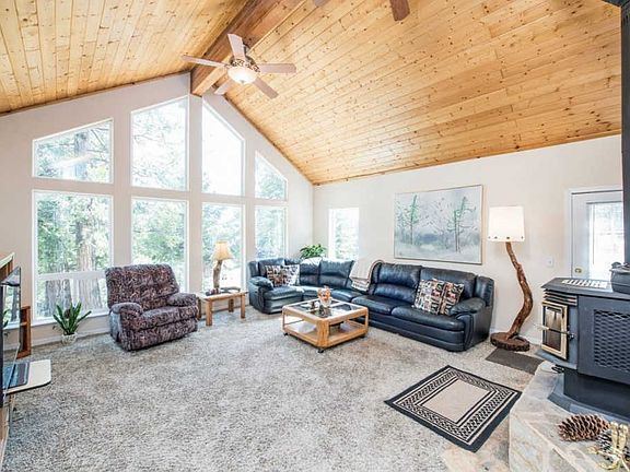 Wonderful floor to ceiling windows in the living room of this one level cabin, offer a beautiful view of the trees. This 3bd/3bth cabin includes a large bonus room/4th bedroom over the garage, its the perfect game room and or sleeps all your extra family and friends! Private hilltop location above the cul-de-sac providing a private setting and easy access. Back yard and deck offer a great setting to BBQ or just hang out. Sleeps up to 12 if you added bunks!