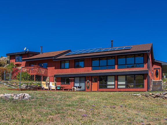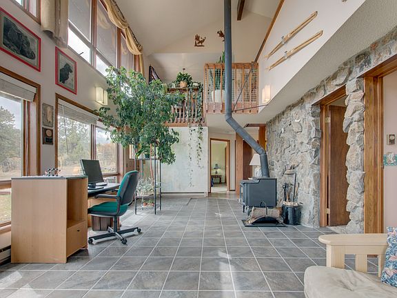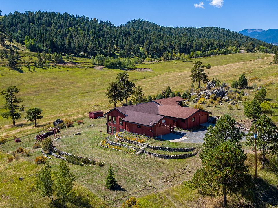 Horse Property, Well designed and built energy efficient home situated on a rare 17.5 flat, usable acres. It's the perfect horse property or mini-ranch. This idyllic setting boasts rock outcroppings, pastures, and impressive views. Passive solar design with a 3.2Kw photovoltaic system (w/ battery backup), provide for low energy bills and peace of mind. 9 inch interior concrete wall absorbs sunlight during day and releases the heat during the night-- Average electric bills $89 p/month. 2 wood stoves. Home is currently configured with a mother in law suite--perfect for a multi generational setup, space for visitors, or use it as a spacious master suite. It has the trifecta of views-- foothills, divide, and city! Two separate garages with space for 3 cars--or keep one as a shop. Easy, flat driveway. 6000 gallon cistern on property. Close to Jeffco Open Space for hiking, biking & horse riding! Aerial tour: https://www.youtube.com/watch?v=kEga9j6Zvbg