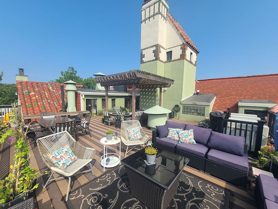 Extra-large, private rooftop deck with French doors from the front hall and master bedroom.