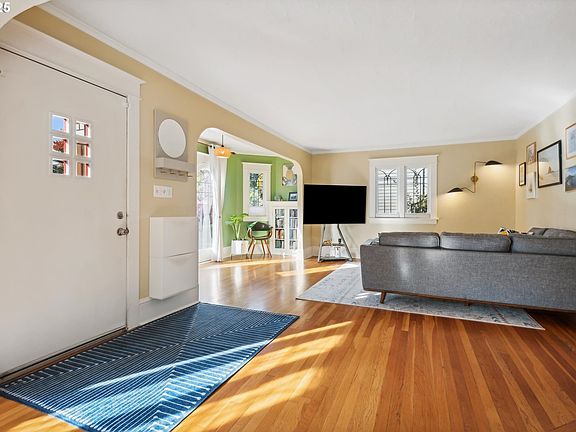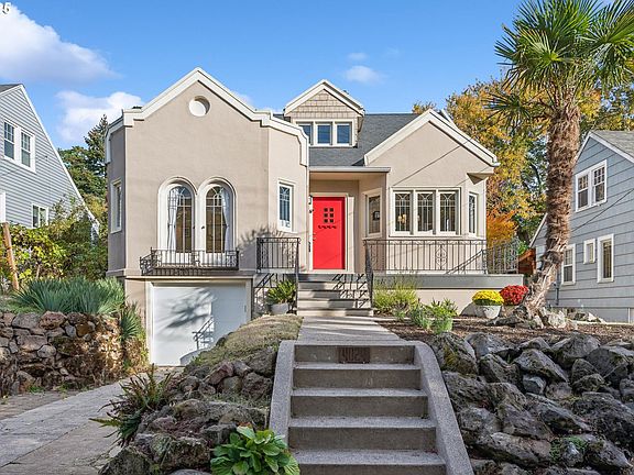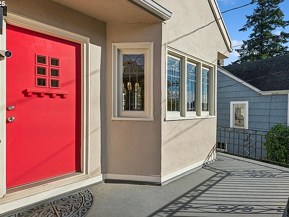 Don't miss this stunning, one-of-a-kind Mediterranean gem in the heart of Sabin! Upon entering, you're greeted by gleaming original hardwood floors bathed in an abundance of natural light. The spacious living room features a cozy fireplace and flows seamlessly into the formal dining room, both adorned with charming leaded glass windows and arched doorways that exude character. The tastefully updated kitchen includes a breakfast nook or open pantry space overlooking the backyard. The main level also boasts a bedroom with exterior glass doors leading to a large back deck, a true highlight of the huge, well-manicured backyard. Upstairs, you'll find two generously sized bedrooms with gorgeous built-in storage. The home is complete with a tuck-under garage, basement storage, stunning low-maintenance landscaping, and an unbeatable location. The seller has made significant updates, including a fully paid-off, energy-efficient heat pump that blows hot and cold air (added in October 2024, not reflected in HES score listed here). Other additions include a new garage door and a stainless-steel gas range, both less than 3 years old. Cosmetic upgrades include new window treatment, new lightning, and fresh interior paint that gives the home a vibrant new personality. Take a look today! [Home Energy Score = 1. HES Report at https://rpt.greenbuildingregistry.com/hes/OR10206227]
