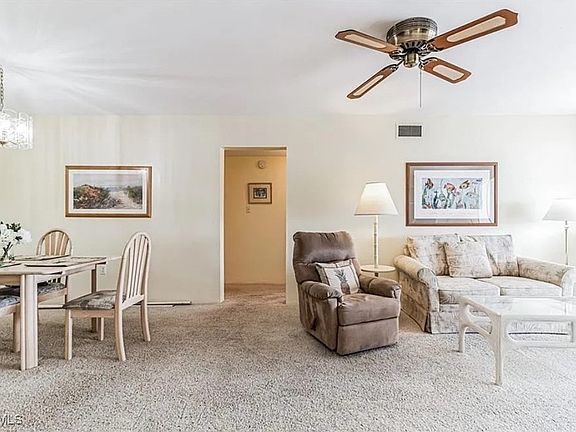 The condo features numerous recent updates, including a new roof, re-piping throughout, new plumbing fixtures, a new electrical panel, and an upgraded vanity in the primary bathroom. The kitchen comes fully equipped with a refrigerator (with ice maker), dishwasher, garbage disposal, range, wine cooler, and ceiling fans. The water heater was replaced in 2020, and the central AC ensures year-round comfort.