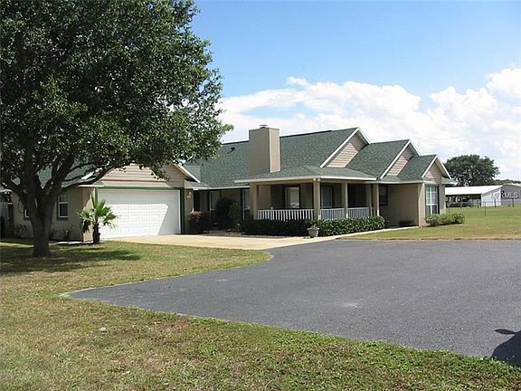 Peace and tranquility is yours from the moment you drive through the gate! 5 acres of fenced yard surround this spacious home. Kitchen comes complete with granite counters, mosaic tile backsplash, stainless appliances, sparkling white cabinets and breakfast bar for 2. Cool tile flooring throughout, great room fireplace, inside laundry, master suite with large closet and bathroom with tub and separate shower. Choose to relax on the covered, screened in breezeway or the wraparound front porch overlooking acres of open fields, perfect spots to unwind after a long day! Community boat ramp access to Lake Yale and Sawgrass Preserve is nearby!
