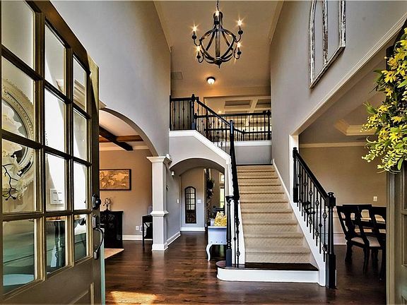 - Interior: 2-Story Foyer, Entrance Foyer, Trey Ceilings, Wall/Wall Carpet, 9 ft + Ceil Main, Bookcases, Exposed Beams, Smart Home Technology