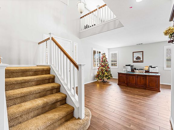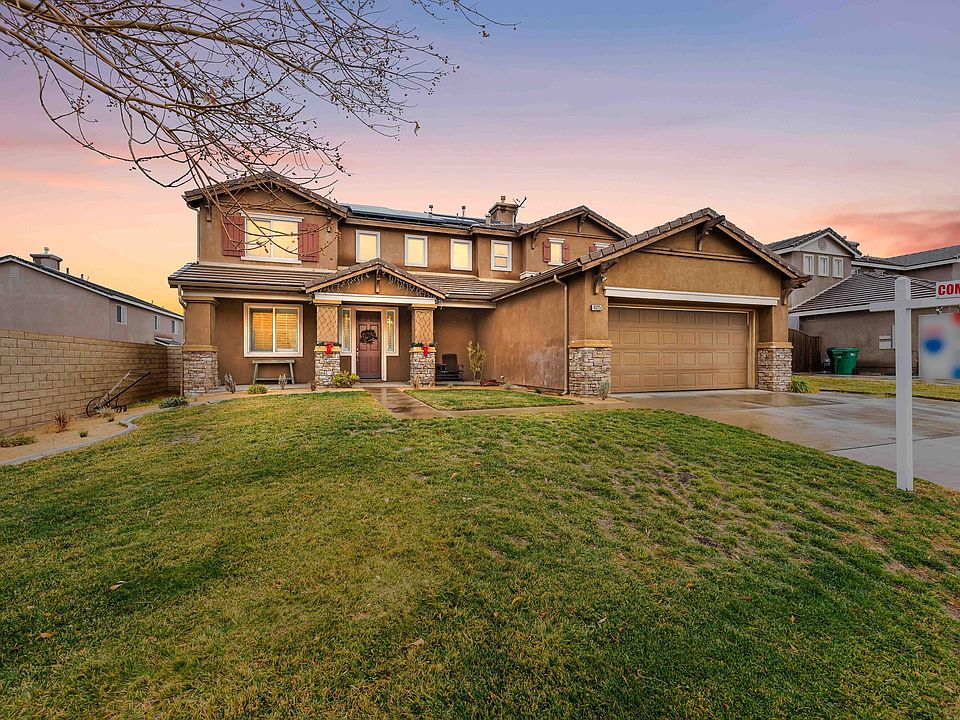 This home is located in a quiet neighborhood. Beautifully landscaped home offers 4 spacious bedrooms with one bedroom situated down stairs along with a full bath. Huge granite countertop in kitchen along with newer cabinets. Tile flooring and carpet throughout. Beautiful high end plantation shutters. Living room, dining room, and family room. Make your way upstairs to three more bedrooms & a great size loft (could be 5th bedroom). Master offers spacious room along with huge master bath that includes a jetted tub, walk in closet, with a custom upgraded walk in shower with double shower head, 1 being a rain shower head. Solar panels are great for those extremely hot summer days. Gorgeous landscaped backyard with paved RV access, block walls and block planters. Three car tandem garage. High brick walls. Don't wait to view this home.