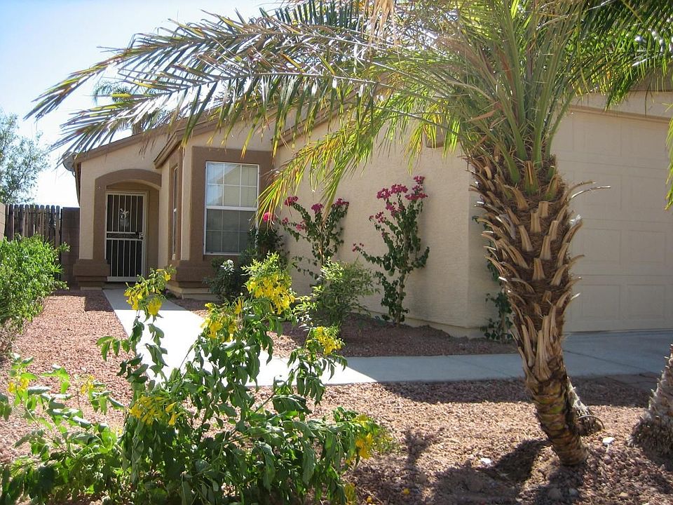 Beautiful home for sale in quiet neighborhood. North Canyon Ranch in Glendale is walking distance to Stetson Village & Safeway! Gorgeous Glendale area home w/new landscaping & fresh 2-tone paint outside & inside! Perfect starter home w/new decor in this 3 bedroom, 2 bath, 2 car garage charmer. Roomy kitchen open to living area, has high breakfast bar & lots of counter space for easy entertaining. Lots of cabinets for storage too. Master has exit door, double sinks, tub & separate large shower. Vaulted ceilings, pot shelves, brand new tiled entry, hall, kitchen, dining & baths. New light fixtures, deep stainless sink & pull-out faucet, fridge, stove, washer & dryer, entire sprinkler sys-tem, rye grass planted in private back yard. Newer carpet. Custom cabinets in garage.